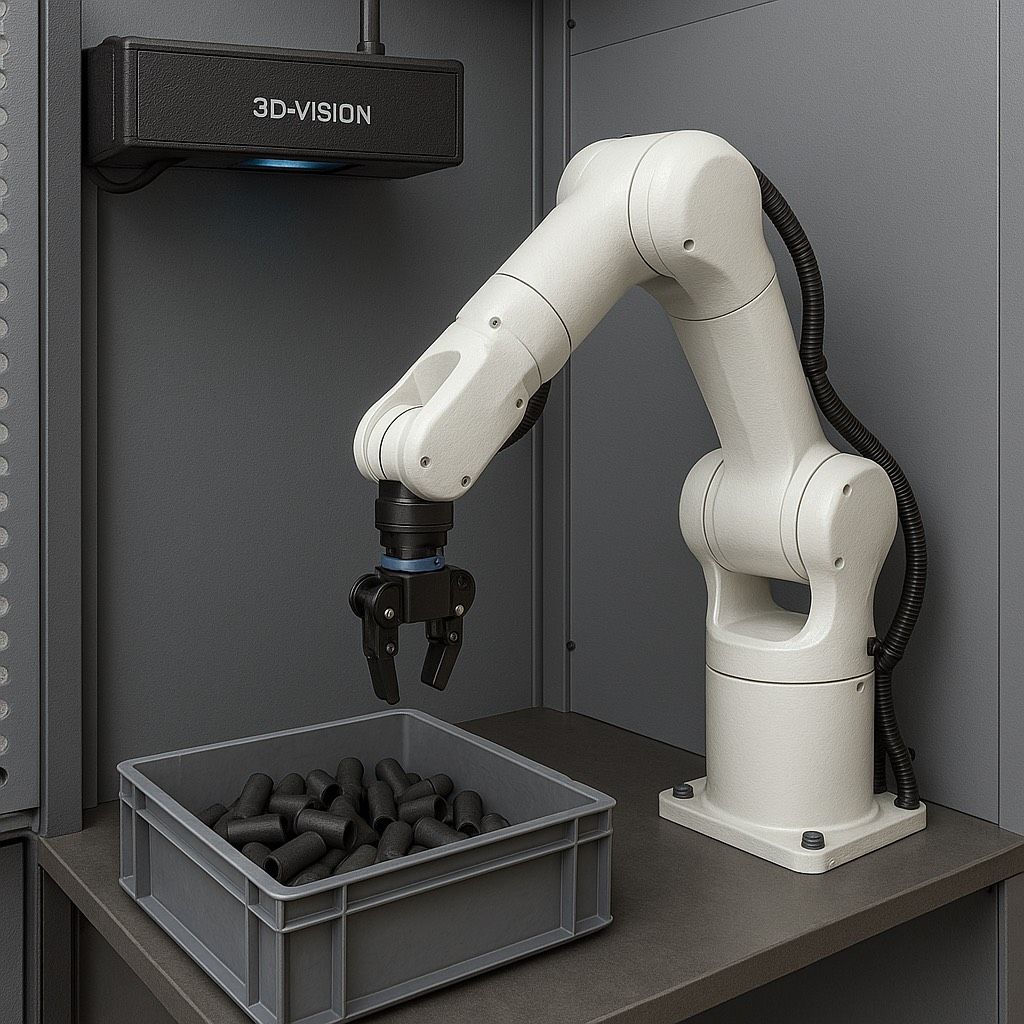 verbindet Robotik, Bildverarbeitung und intelligente Software zu einem System, das zuverlässig Teile aus chaotisch gefüllten Kisten greift und geordnet weitergibt.
